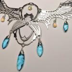 Inspired by a scarab, symbol of renewal and rebirth, and adorned with some really elegant faceted Blue Apatites and Ethiopian Opals. The wings are made from stainless steel in order to achieve this very delicate and thin design. All other components (clasp, rings, wire, chain) are sterling silver. For size reference, wingspan of the lowest set of wings is 4.25 inches across. Length of chain can be custom adjusted to your specification upon ordering.