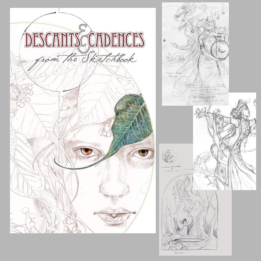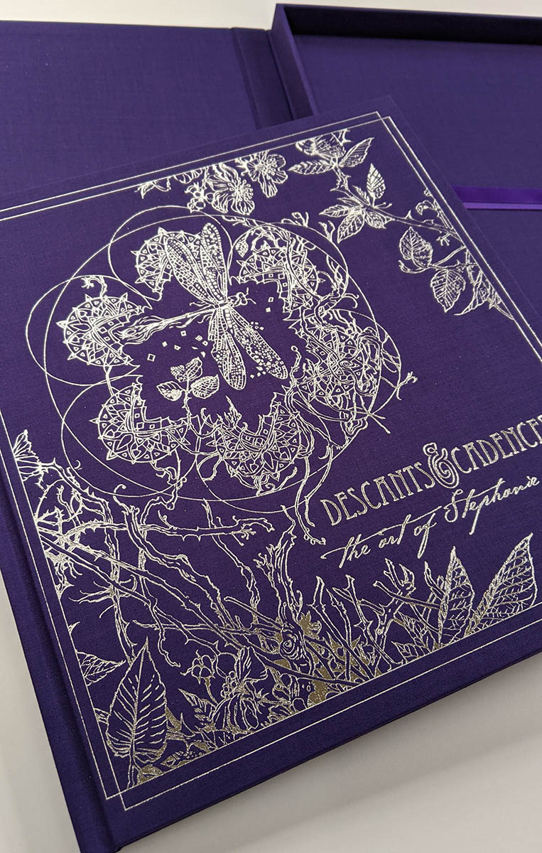 Descants & Cadences is a 128-page art book featuring work from 2012-2016: The Magpie series, The Stag Sonata Cycle, Insecta, Strange Dreams, Tales. This Special Edition is Limited to 400 copies, and only 20 copies are in remaining available stock. Each book is hand signed and numbered, and an individual remarque is drawn in ink on the special title page reserved for this special customization. Comes with a protective clamshell case to keep this treasured volume safe, and showcase it! * Silver gilded page edges